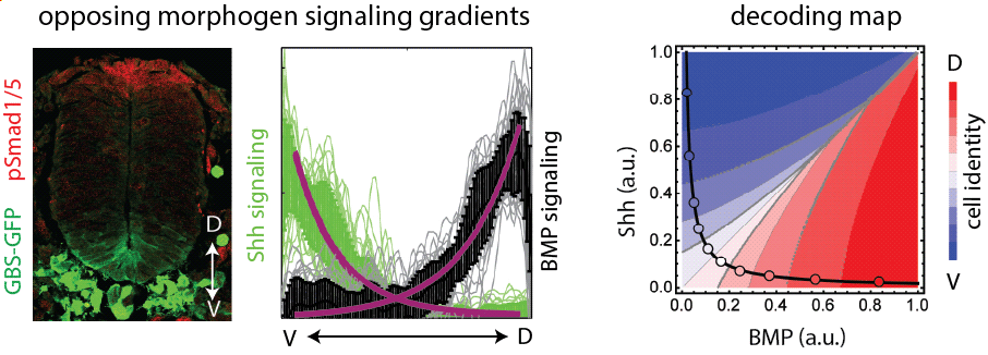 An essential part of the vertebrate central nervous system, the spinal cord relays motor and sensory information between the body and the brain. In this organ, a highly conserved pattern of neural progenitor subtypes is established along the dorsoventral (DV) axis as the tissue grows, which makes it an ideal system to study morphogen-mediated development. It is an experimentally tractable system, where embryonic stem cell differentiation, the mouse and chick model systems can be used in a complementary manner. We and others have developed tools that allow quantitative measurements and analysis of spinal cord development. The questions about size, reproducibility, patterns and dynamics that we ask are inherently quantitative, hence in our work we aim to obtain quantitative and dynamic data. To combine these data with mathematical modeling and theoretical descriptions, we have a mix of experimentalists and theorists in the group and we work in close collaboration with biophysicists.